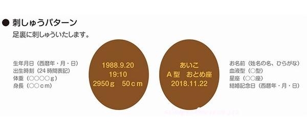 下記のように、血液型と星座の代わりにお父さんお母さんありがとう、感謝などのオリジナルメッセージの刺繍が出来ます。