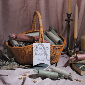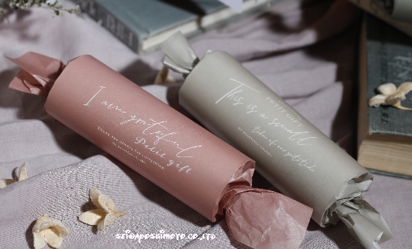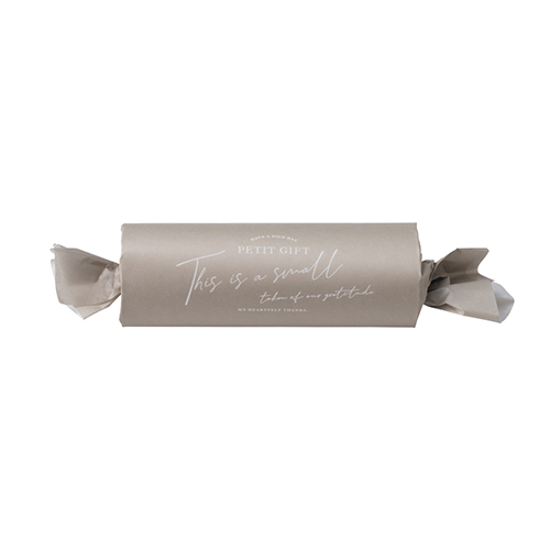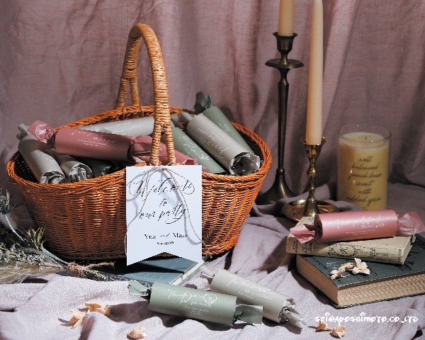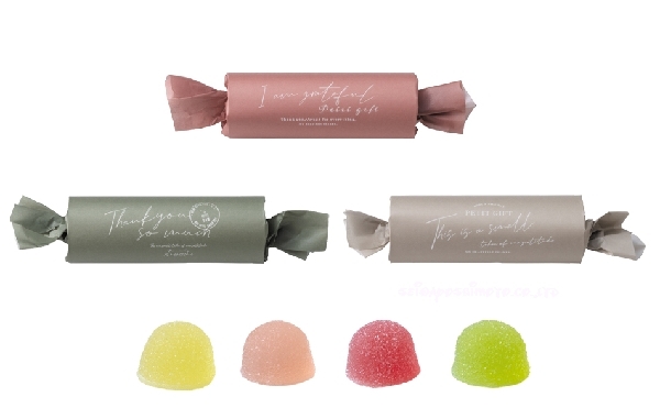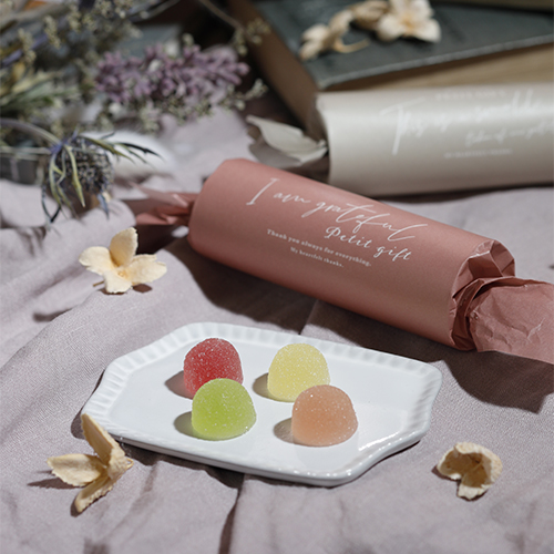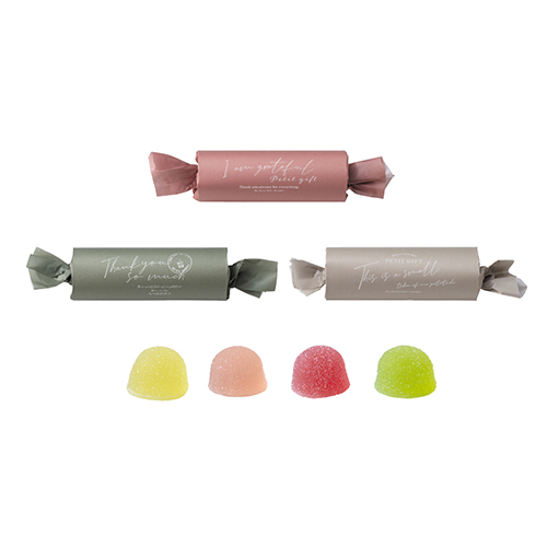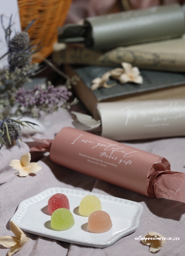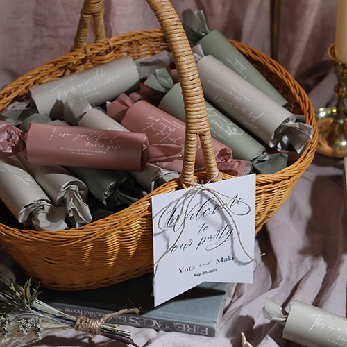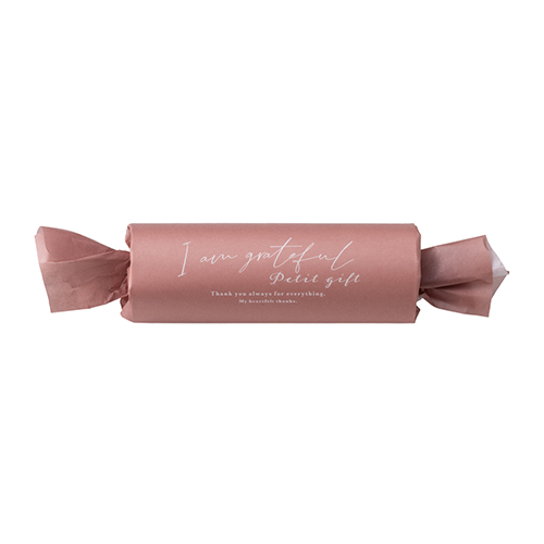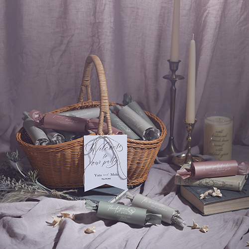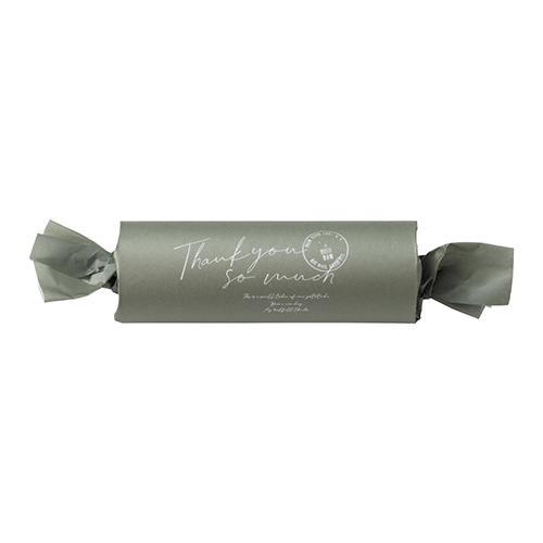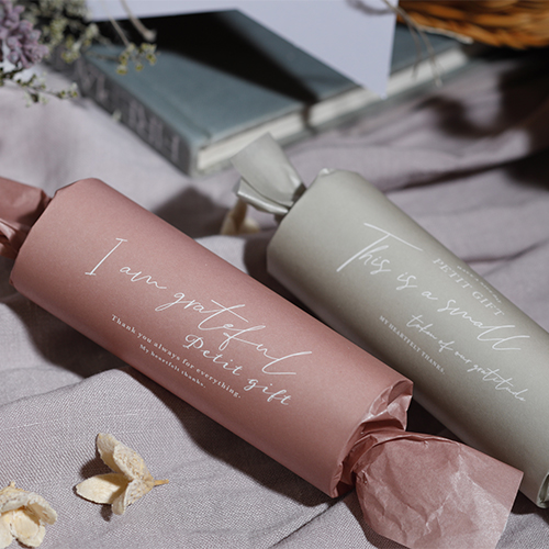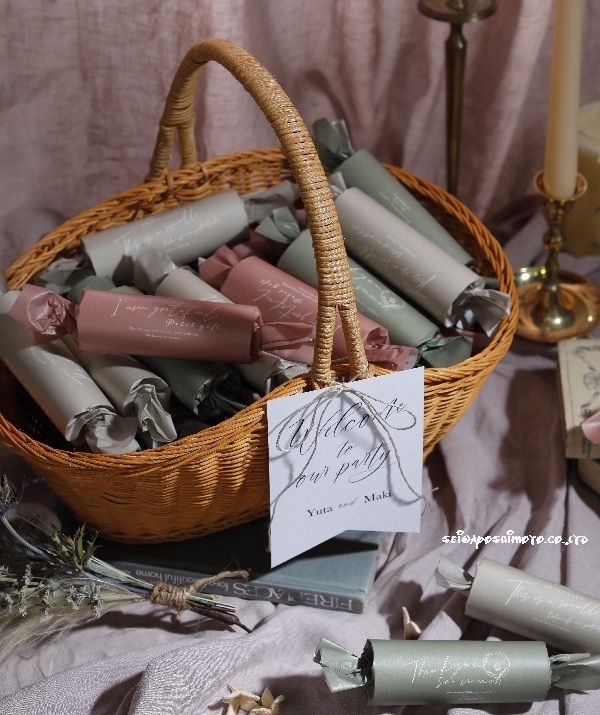 柔らかな質感の紙をラフに巻いたプチギフトは、さらりと渡せるカジュアル感とくすんだ色味の女性らしく優美な配色が空間を大人っぽくしてくれます。